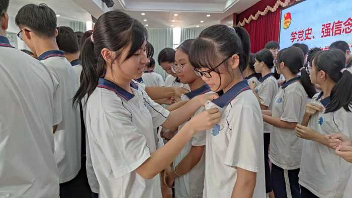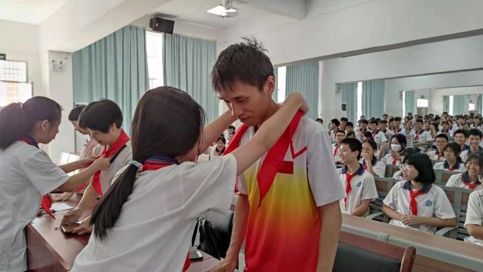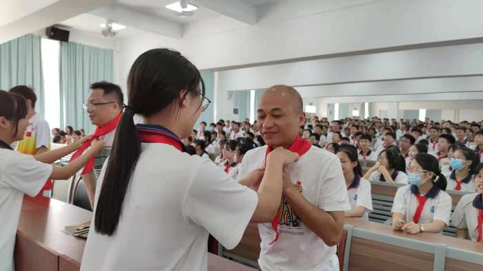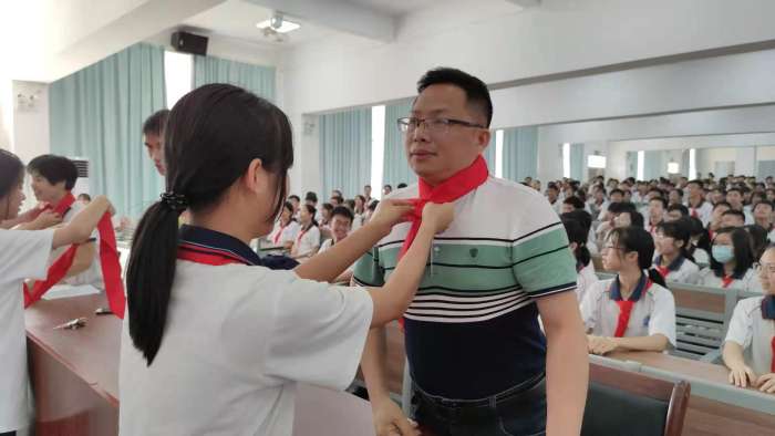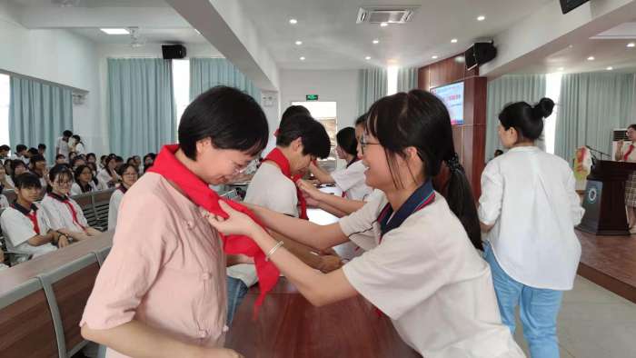 隊(duì)員們?yōu)轭I(lǐng)導(dǎo)、嘉賓佩戴紅領(lǐng)巾,一起感受這莊嚴(yán)的時(shí)刻。