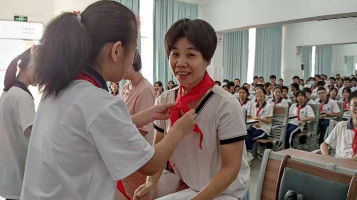 隊(duì)員們解下胸前的紅領(lǐng)巾,折疊好,在少先隊(duì)大隊(duì)輔導(dǎo)員孫明容老師的帶領(lǐng)下,少先隊(duì)員們正式向紅領(lǐng)巾告別,同時(shí)也告別少年時(shí)代,以青春活潑、積極向上的面貌迎接青年時(shí)代。