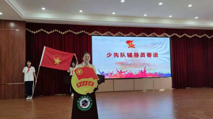 最后,全體八年級(jí)少先隊(duì)員面向隊(duì)旗,敬最后一個(gè)隊(duì)禮,在隊(duì)旗前進(jìn)行最后一次呼號(hào)。少先隊(duì)大隊(duì)輔導(dǎo)員孫明容老師帶領(lǐng)全體學(xué)生呼號(hào): “時(shí)刻準(zhǔn)備著!”“為共產(chǎn)主義事業(yè)奮斗終身!”隊(duì)員們鏗鏘有力的呼號(hào)聲響徹整個(gè)演播廳。