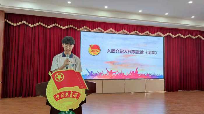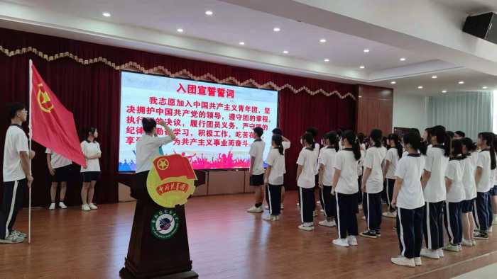 新團(tuán)員們?cè)诓坛療j紀(jì)念中學(xué)第三期團(tuán)校培訓(xùn)班班主任聶嬌麗老師的帶領(lǐng)下,以最洪亮的聲音、最飽滿的精神狀態(tài)莊嚴(yán)宣誓,表達(dá)了為共產(chǎn)主義事業(yè)而奮斗的心聲。51名同學(xué)光榮地加入了中國(guó)共產(chǎn)主義青年團(tuán)。